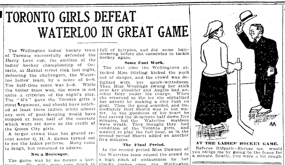 While it isn’t part of the Professional Women’s Hockey League (PWHL), Waterloo has a women’s hockey history connection wherein Waterloo’s team played against the Toronto Wellingtons in a championship. According to a Toronto Star reporter, during the last period in a game on February 15, 1907, “Miss Dawson [of Waterloo] led the attacks and everybody except the goalkeeper—including the girl who fell down every time she made a rush—was there, and they gave the Torontonians the busiest five minutes you ever saw” (34). Toronto won that game 6-0 but the teams played before a crowd of 700 at the Ontario ladies hockey championship, according to Brian McFarlane’s Proud Past, Bright Future history of women’s hockey in Canada.
